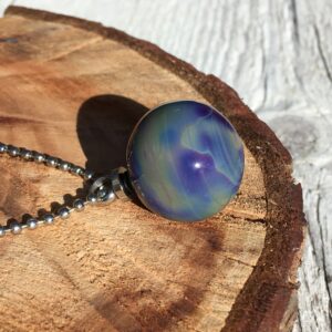 Grote bolle kralen met een ingesmolten moertje. Hierdoor zijn deze kralen geschikt om als hanger te dragen aan het wisselhangertje voor grote glasbollen.