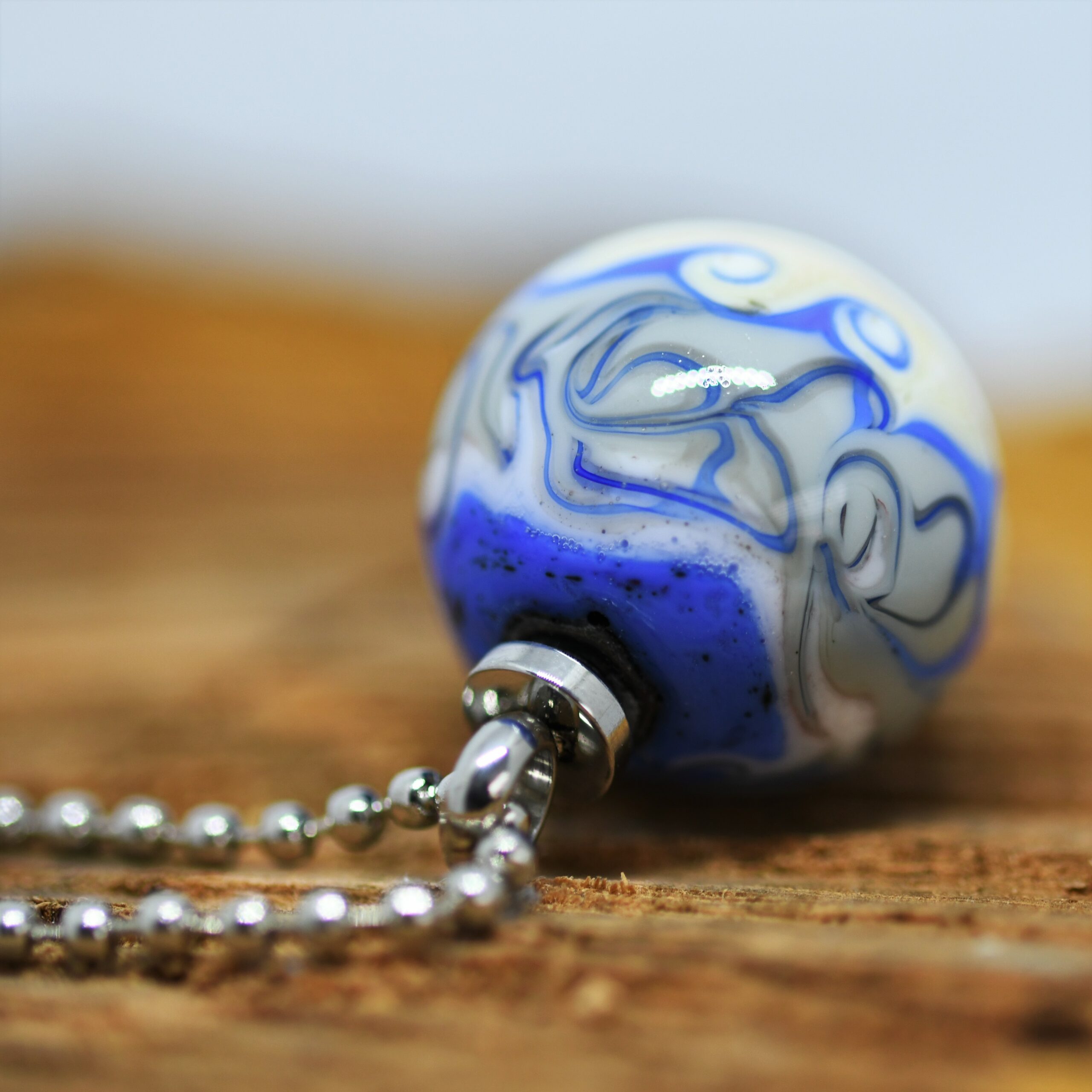 Glasbol om aan de kleine wisselhanger te dragen, mooi aan een langere ketting. In deze bol zijn het strand en de branding te zien.