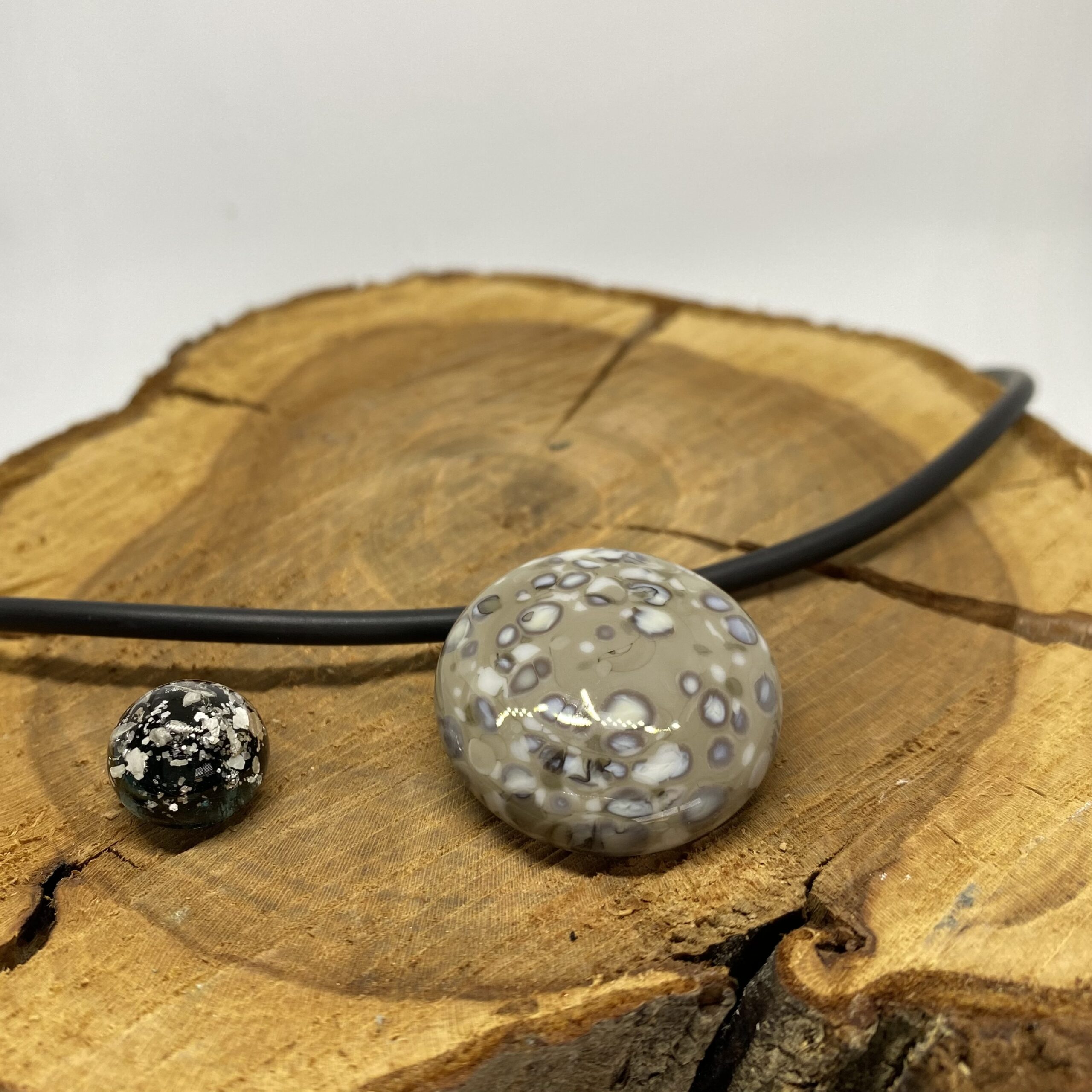 Glastop in warmgrijs, met ingesmolten glasfrit. Een mooie gladde top in natuurlijke kleuren. Hij hangt erg mooi aan de ketting met hanger, maar is ook geschikt om als grote ringtop te dragen.