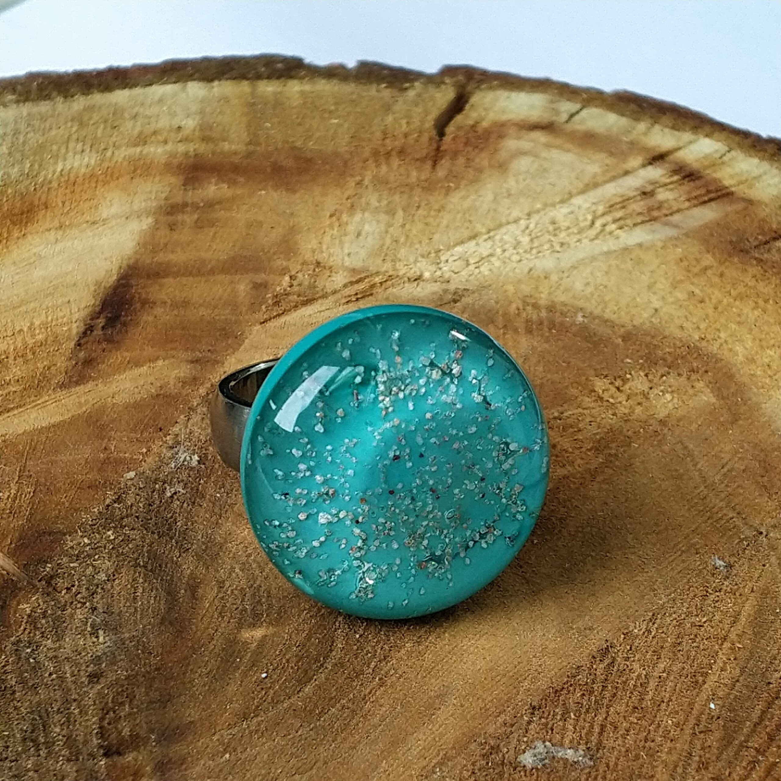Zomerse glastop om op je wisselring of hanger te dragen. Met ingesmolten zand van het Zeeuwse strand, waar ik 1 km. vandaan woon.Voor de basis is turquooise glas gebruikt. Door de bolle vorm worden de zandkorreltjes vergroot.